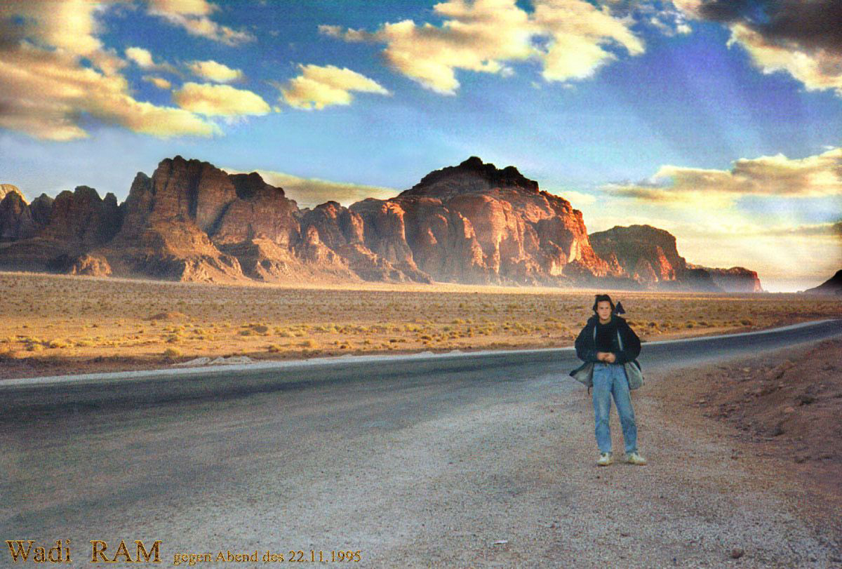 Nein, Boris wollte nicht da hin weil der Wadi Ram (*) heist und der Tron vom Film ja im RAM war. Er kannte ganz gut die Geschichte des Nahen Ostens, besonders die von Lawrence von Arabien. Lawrence war ja wirklich im Wadi Ram und der berühmte Film über sein Leben wurde auch dort in Jordanien gedreht. Boris sah den Film etliche male und war ganz verückt nach der Musik und der Landschaft, besonders der Wüste.